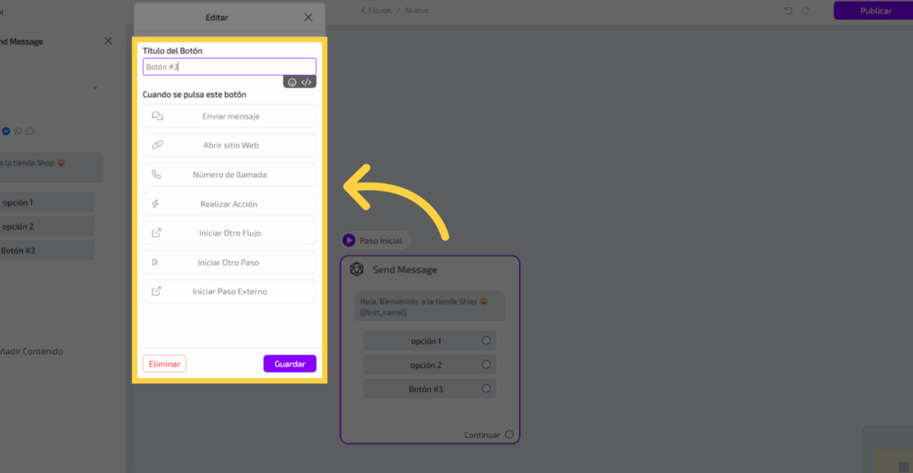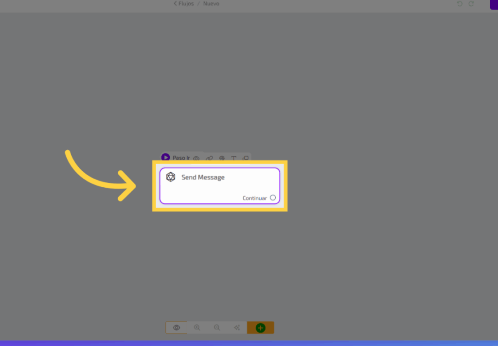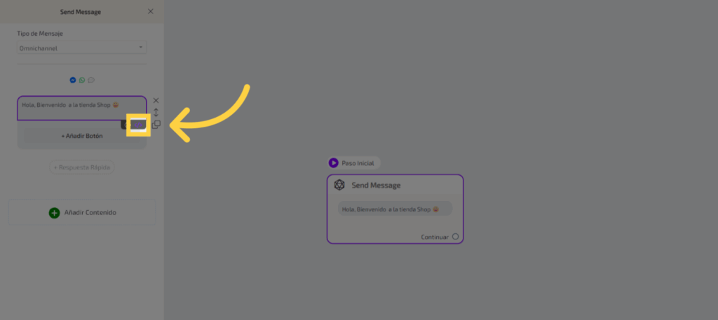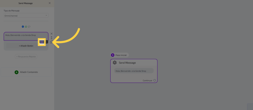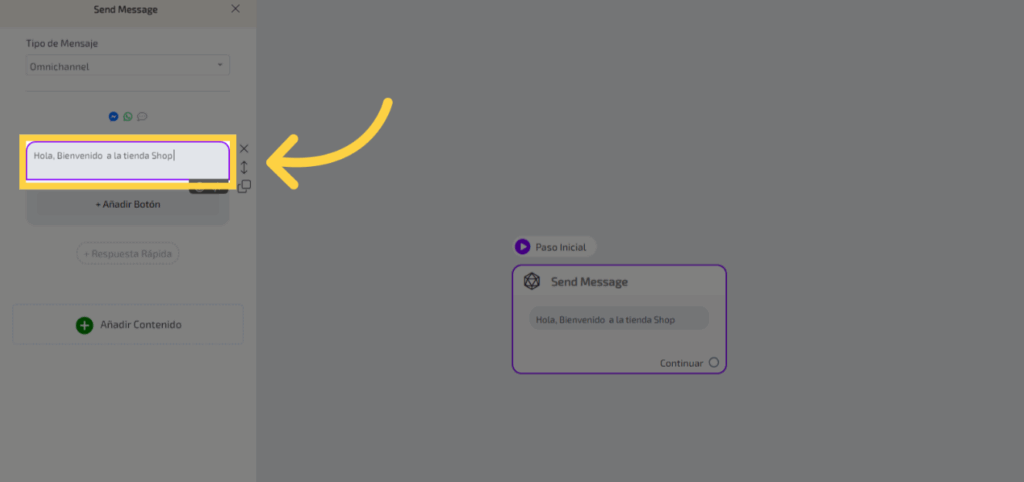 Para agregar un texto a un paso del flujo, haz clic en el cuadro correspondiente para abrir el editor.