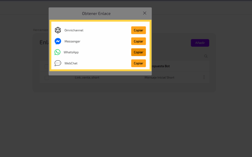 Copia el enlace generado para cada canal específicamente y el omnicanal que le preguntará al usuario por cual canal quiere comunicarse