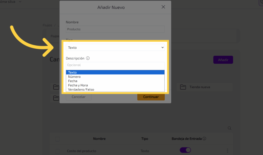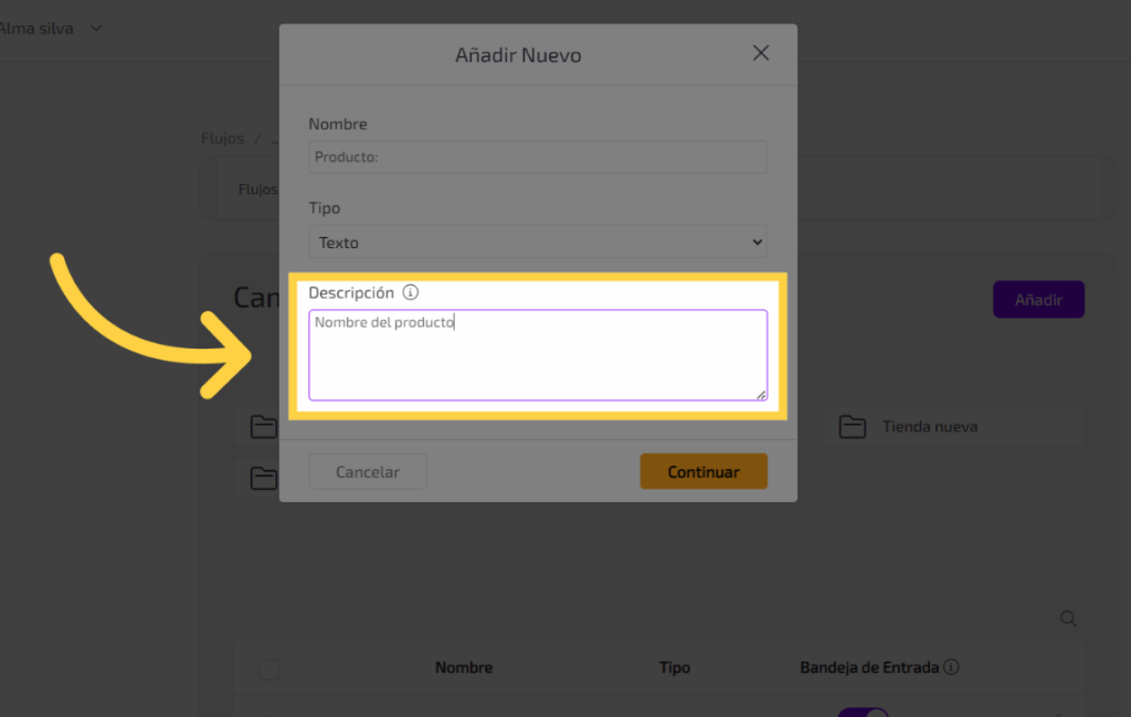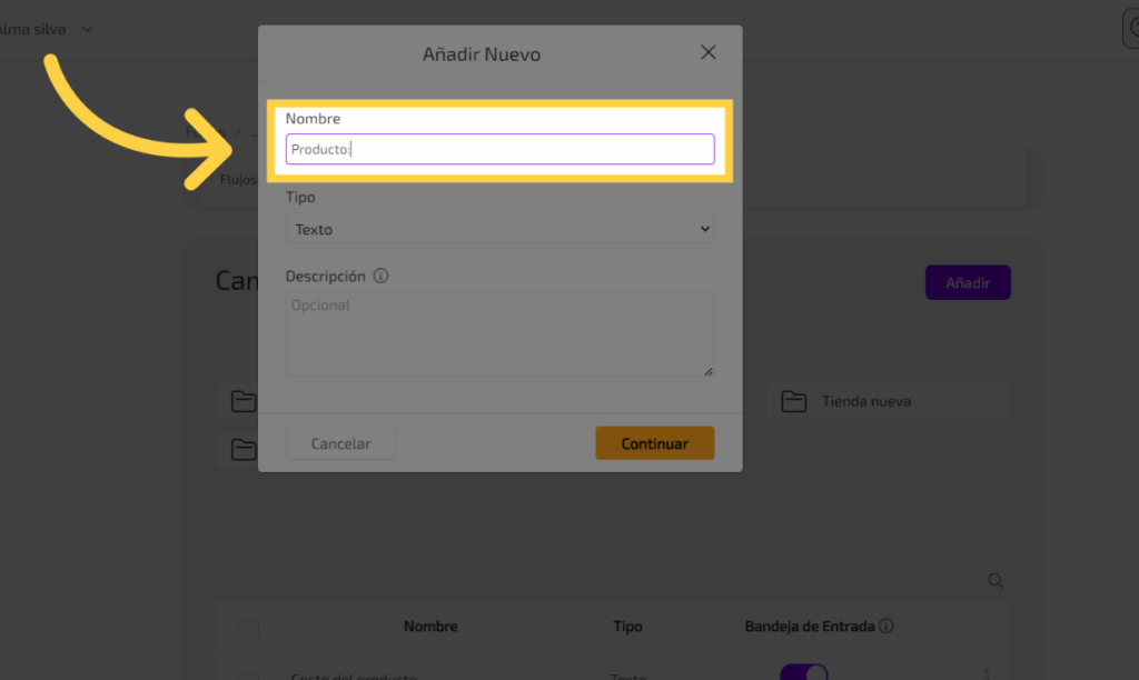 Rellena el campo con el nombre del dato que se quiere almacenar , por ejemplo, “Producto:”.