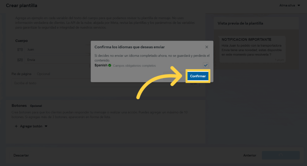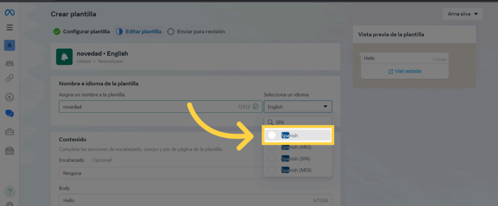 Selecciona el idioma de la plantilla en este ejemplo “Spanish”.