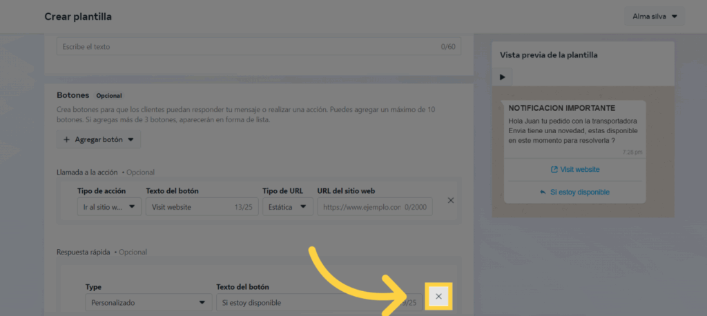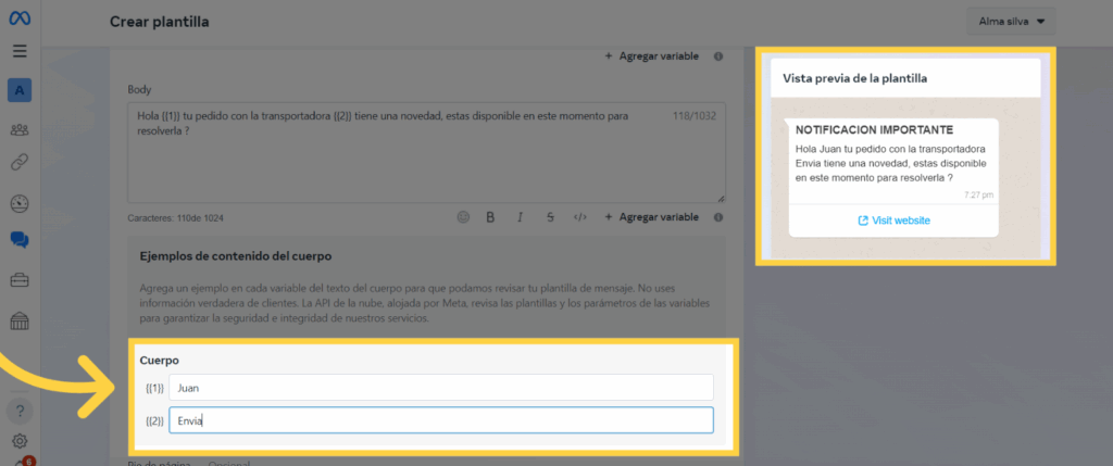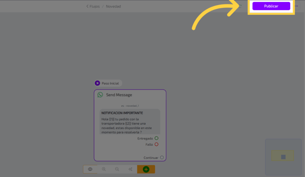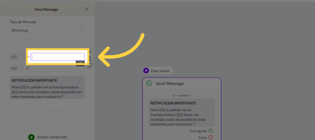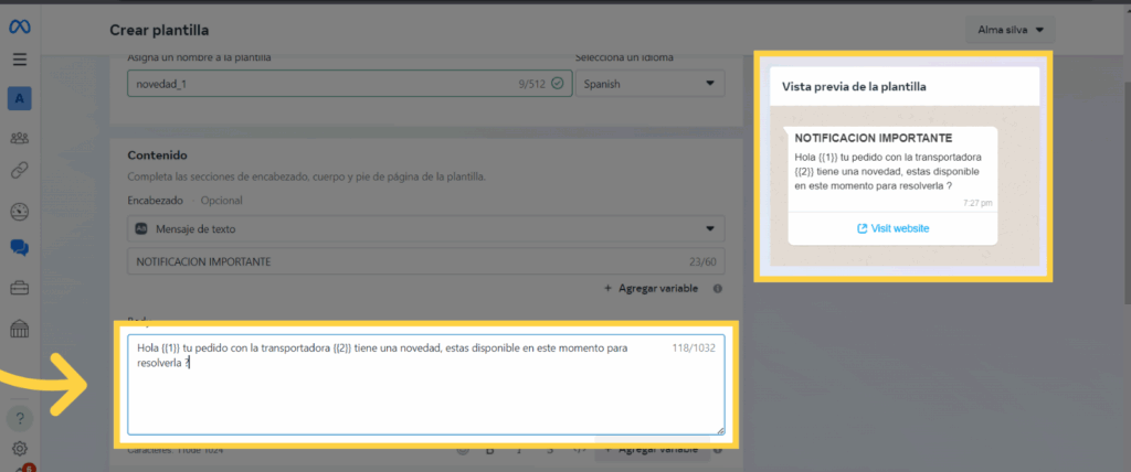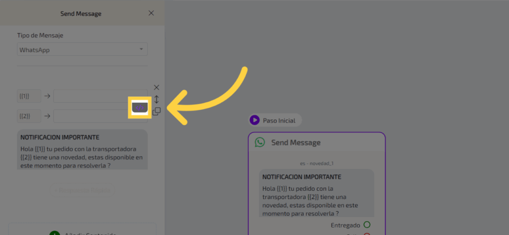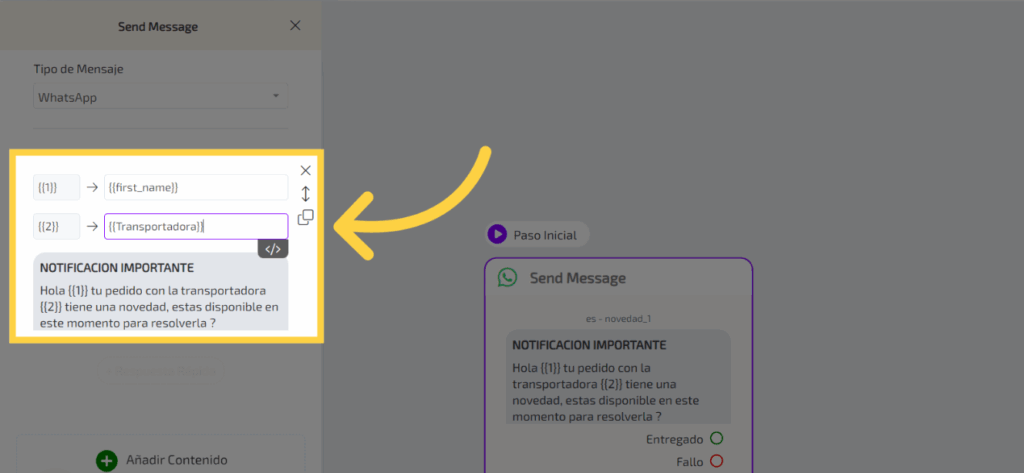 19. Llenar “Hola {{1}} tu pedido con la transportadora {{2}} tiene una novedad, estas disponible en este momento para resolverla ?”