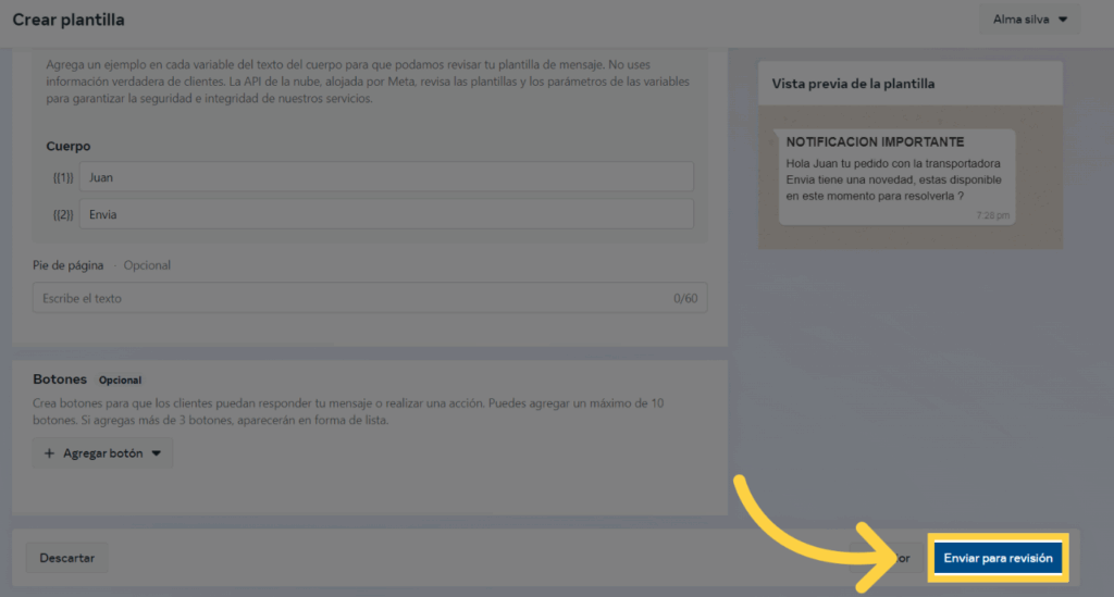 Finalizando haciendo clic en Envía la plantilla para su revisión.