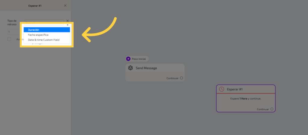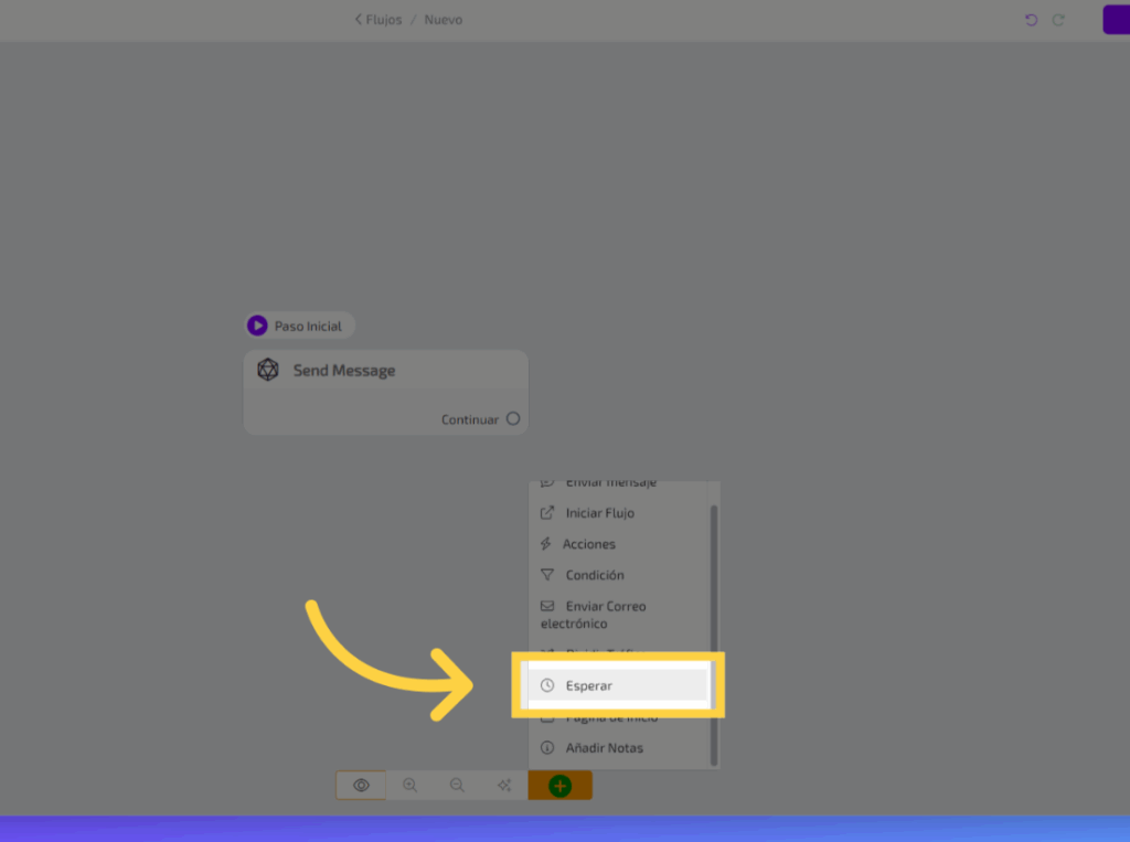 se abrirá una barra de opciones, Seleccione “Esperar ” para configurar una pausa en el flujo.