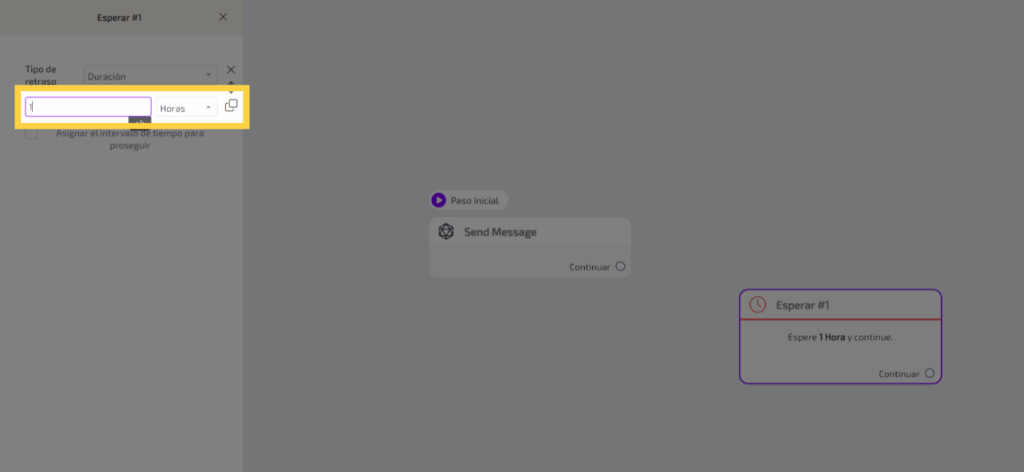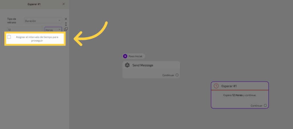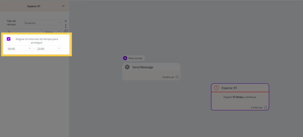 También existe la opción de asignar un intervalo de tiempo para continuar con el flujo. Si deseamos que este se continúe solo en horarios específicos, podemos configurarlo según nuestras necesidades.