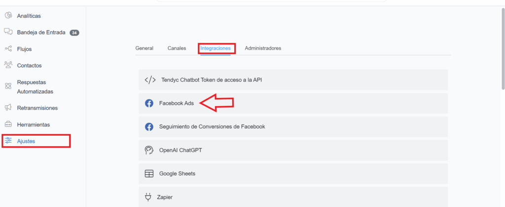 Nota: Para usar esta función, necesitas integrar los Anuncios de Facebook con la plataforma AdsmartBot (Configuración >> Integración >> Anuncios de Facebook).