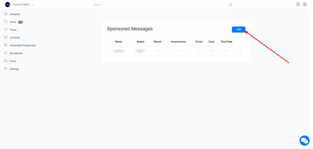Para enviar un mensaje patrocinado, ve a Difusión > Mensajes Patrocinados.