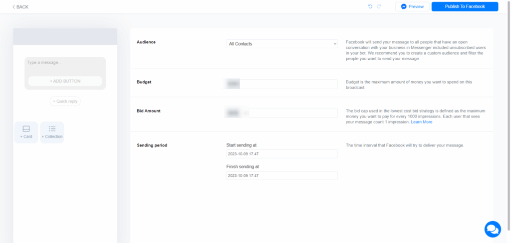 Período de envío: El intervalo de tiempo en el que Facebook intentará entregar tu mensaje. Después de configurar todo, te recomendamos previsualizar el flujo de chat una vez para asegurarte de que todo funcione bien.
