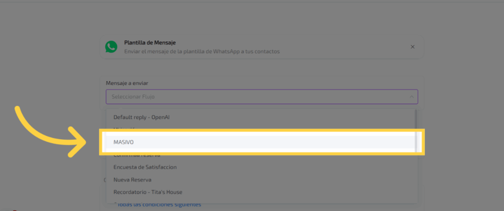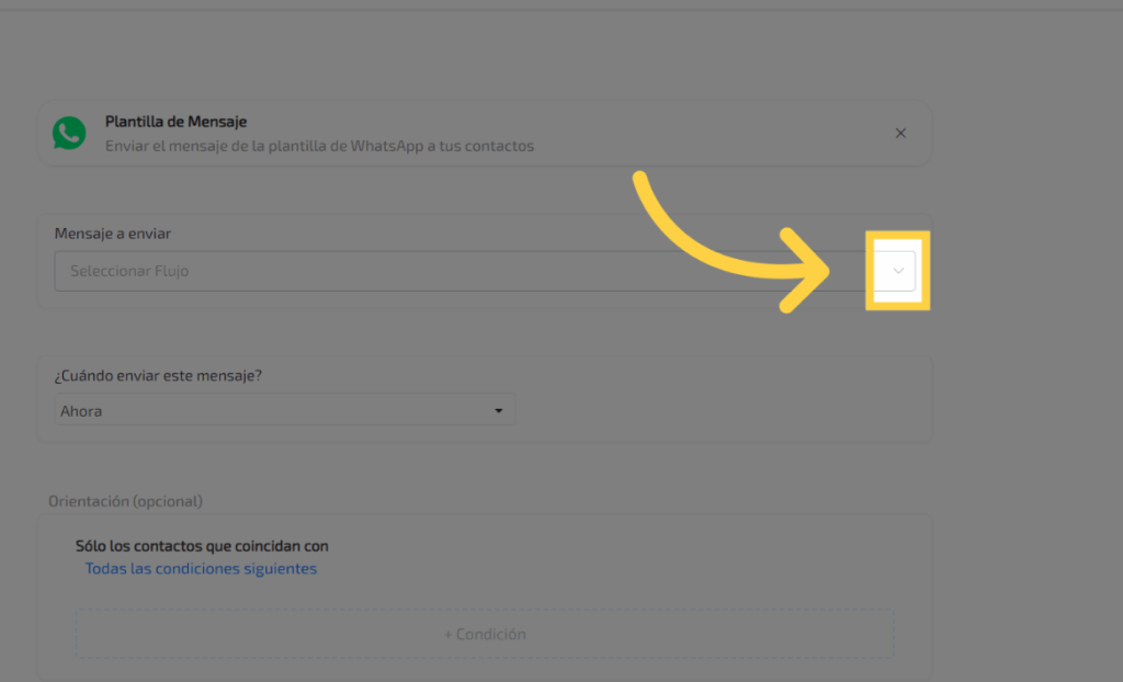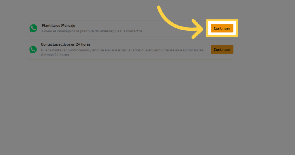 Para enviar un mensaje masivo por WhatsApp, recuerda que debes haber creado una plantilla con anticipación. De lo contrario, solo podrás enviar mensajes a los contactos con los que hayas interactuado en las últimas 24 horas. Ahora, selecciona la opción “Plantilla de mensajes”.