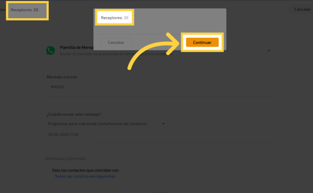 Podrás ver exactamente a cuantos contactos se les enviara el mensaje, para Finalizar el proceso haz clic en “Continuar”.