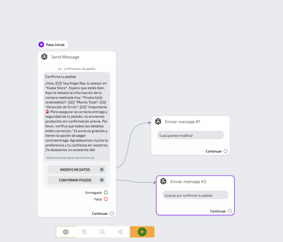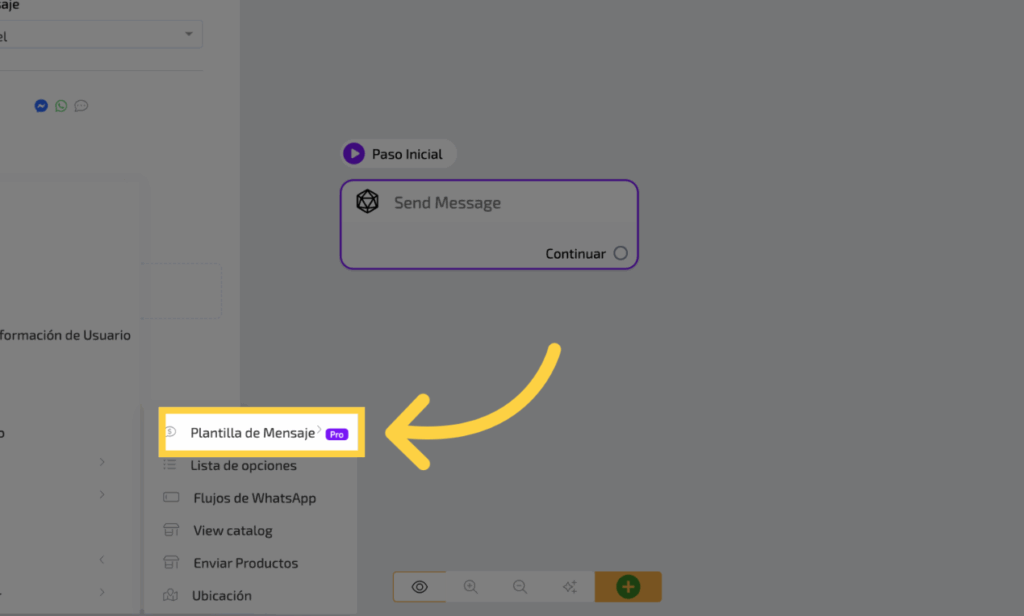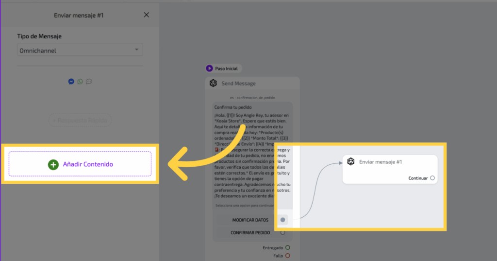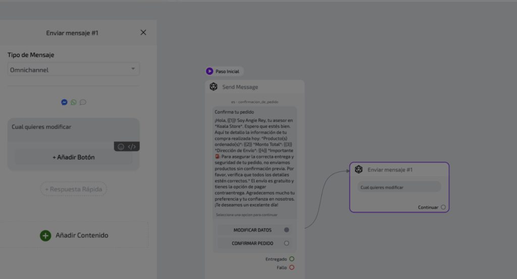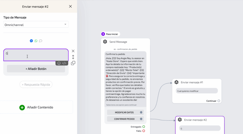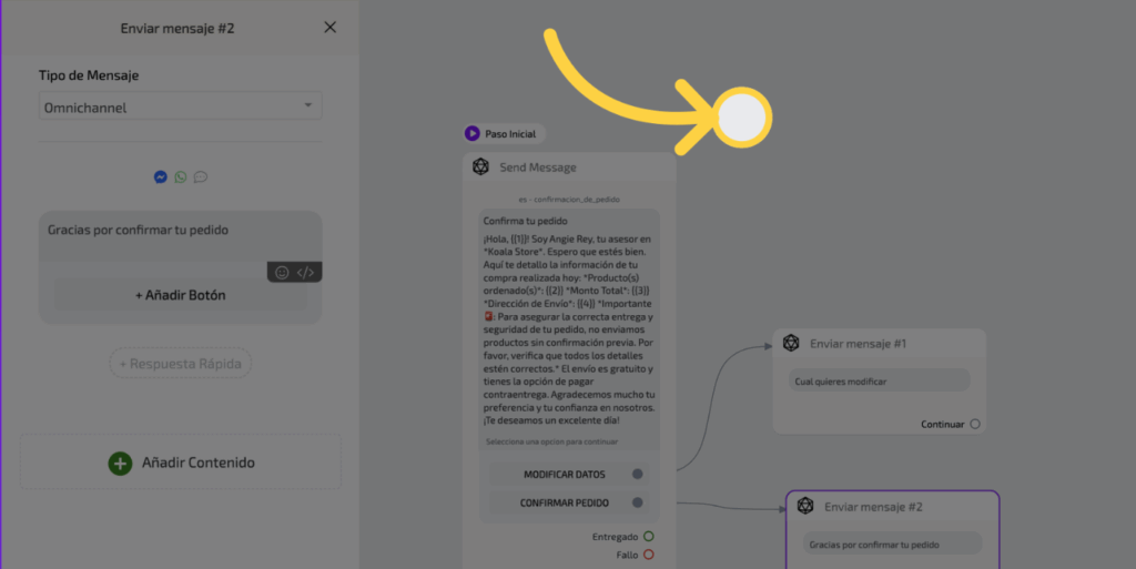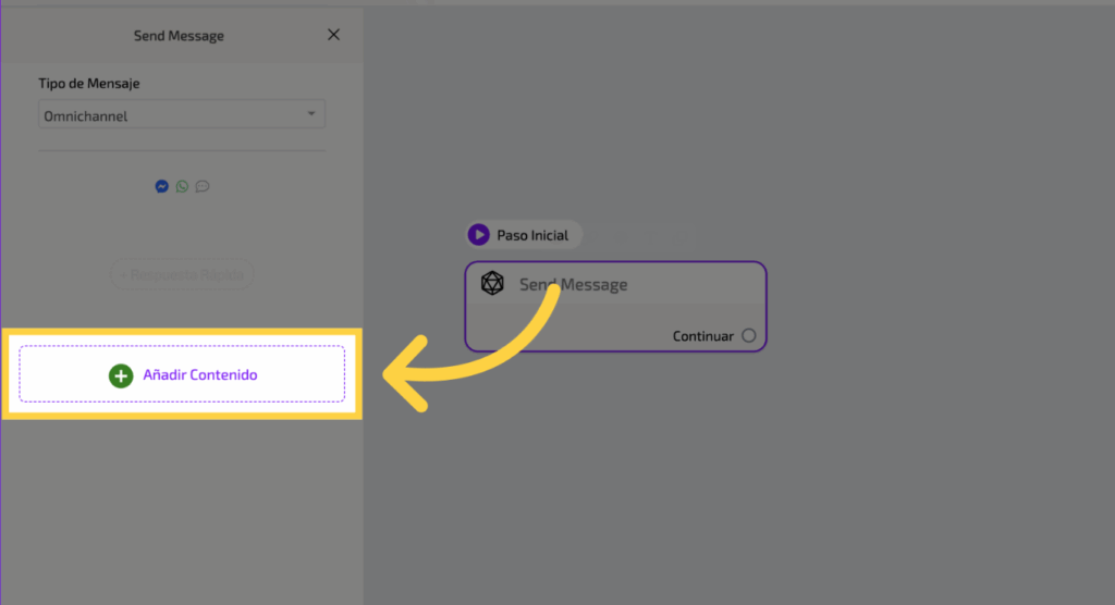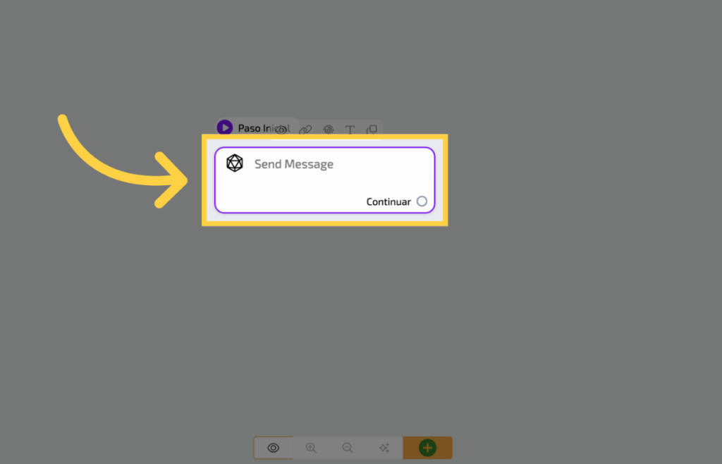Arrastra el botón desde el punto gris de algún botón. Esto abrirá un nuevo paso de “Enviar mensaje”. Aquí deberás añadir el contenido que deseas que ocurra cuando el cliente haga clic en ese botón. Por ejemplo, puedes configurar que se envíe un mensaje, un video, conectar a otro flujo, conectar a un flujo de IA, añadir una etiqueta, y cualquier otra acción que se te ocurra.