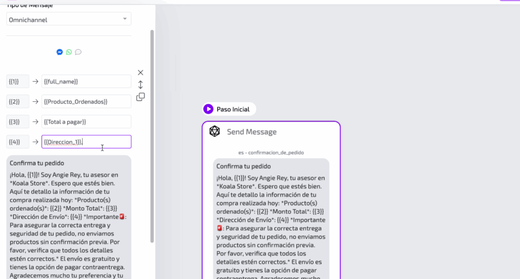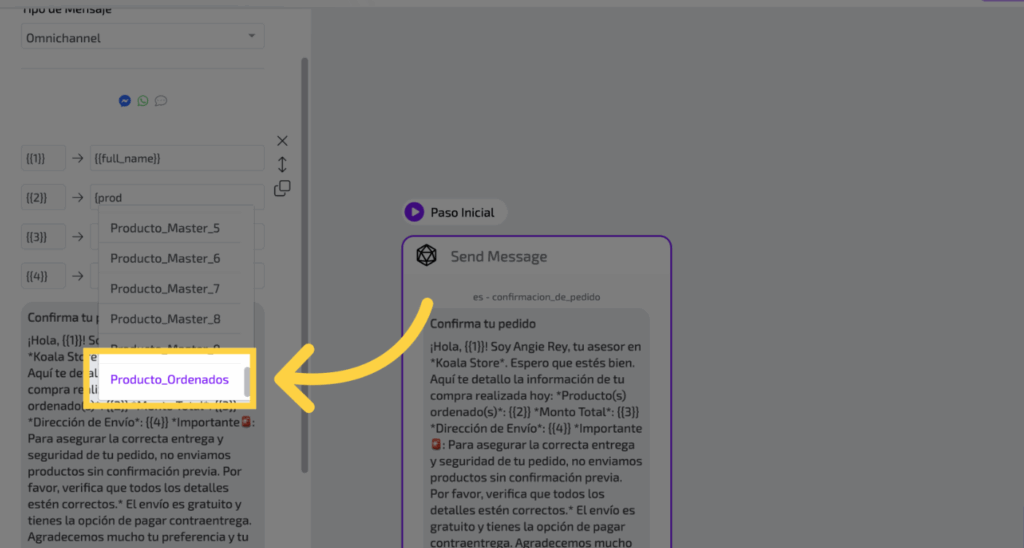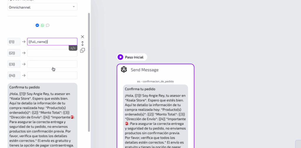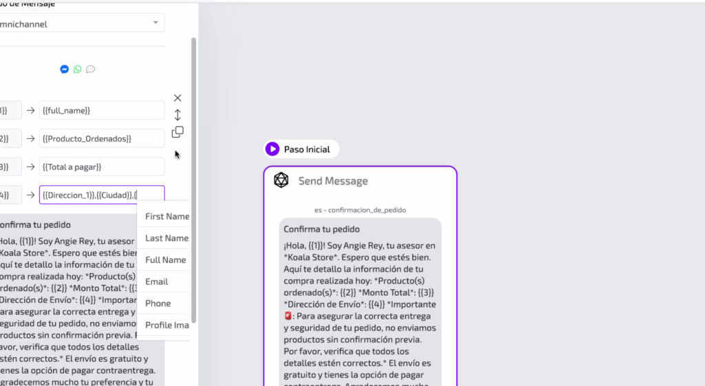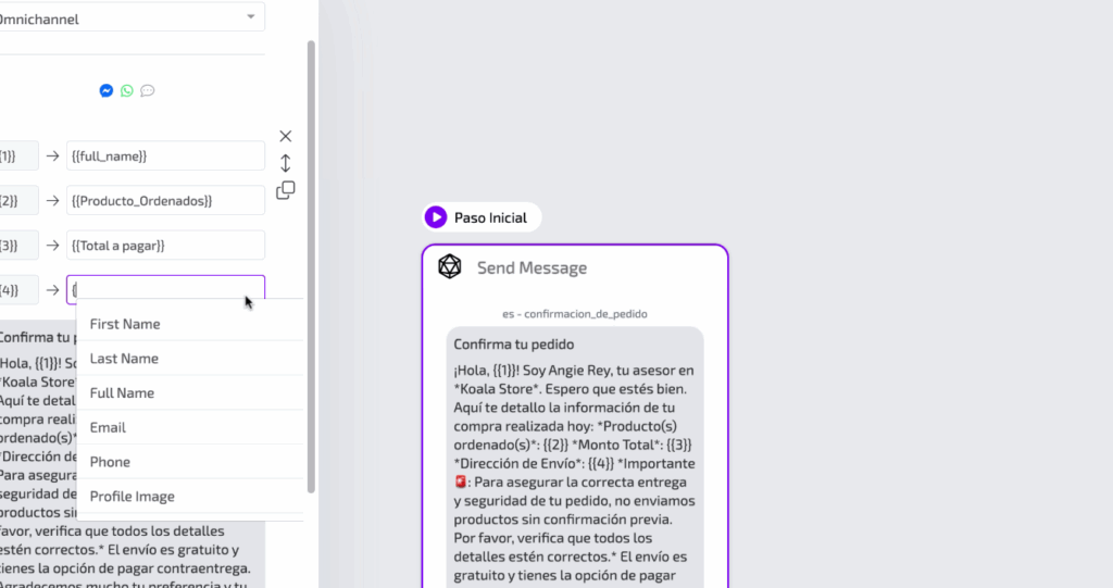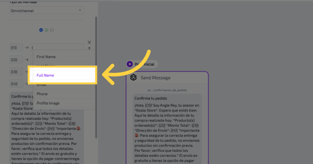 Si la plantilla que creaste tiene variables, deberás indicar qué campo personalizado de AdsmartBot corresponde a esa variable. Por ejemplo, si la variable uno debe ser el nombre, seleccionaremos el campo personalizado “Full Name” para esa variable, de la siguiente manera…