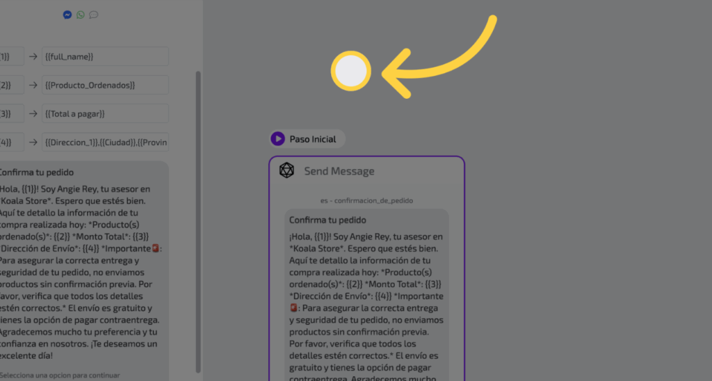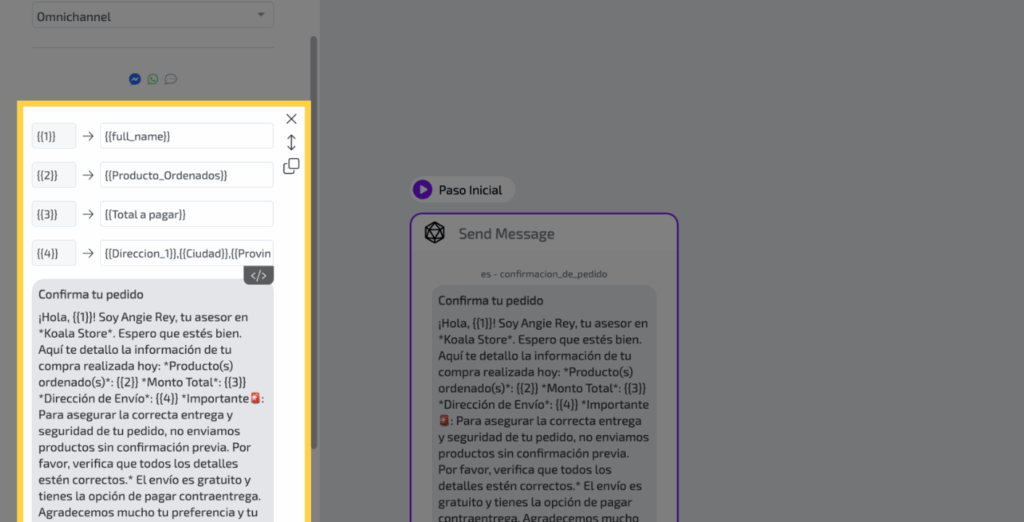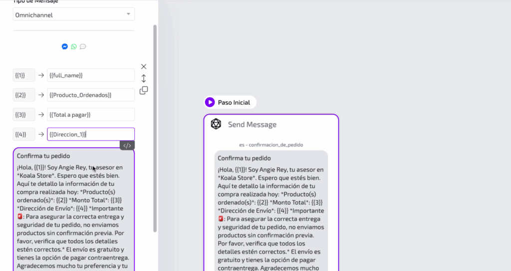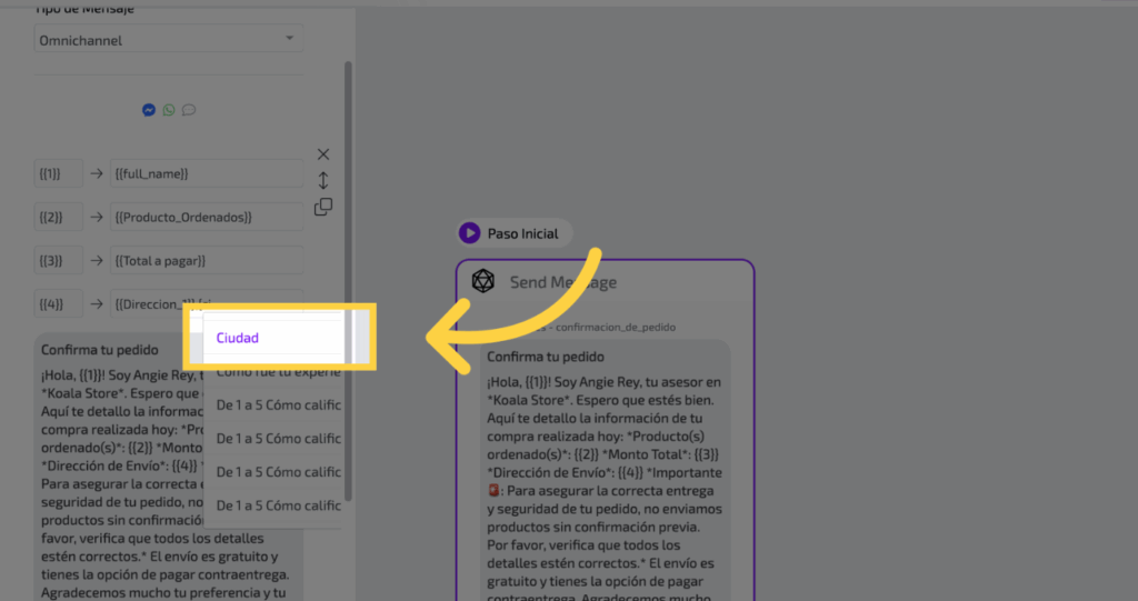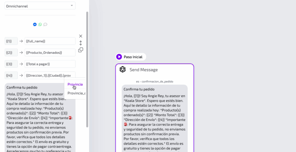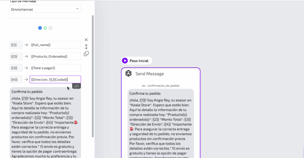 Si la plantilla que creaste tiene variables, deberás indicar qué campo personalizado de AdsmartBot corresponde a esa variable. Por ejemplo, si la variable uno debe ser el nombre, seleccionaremos el campo personalizado “Full Name” para esa variable, de la siguiente manera…