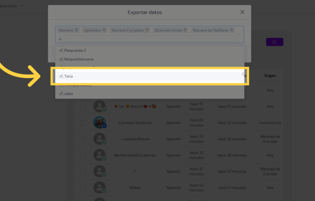 Rellena el campo con la letra A . Automaticamente se te cargue el listado de datos que se pueden exportar.