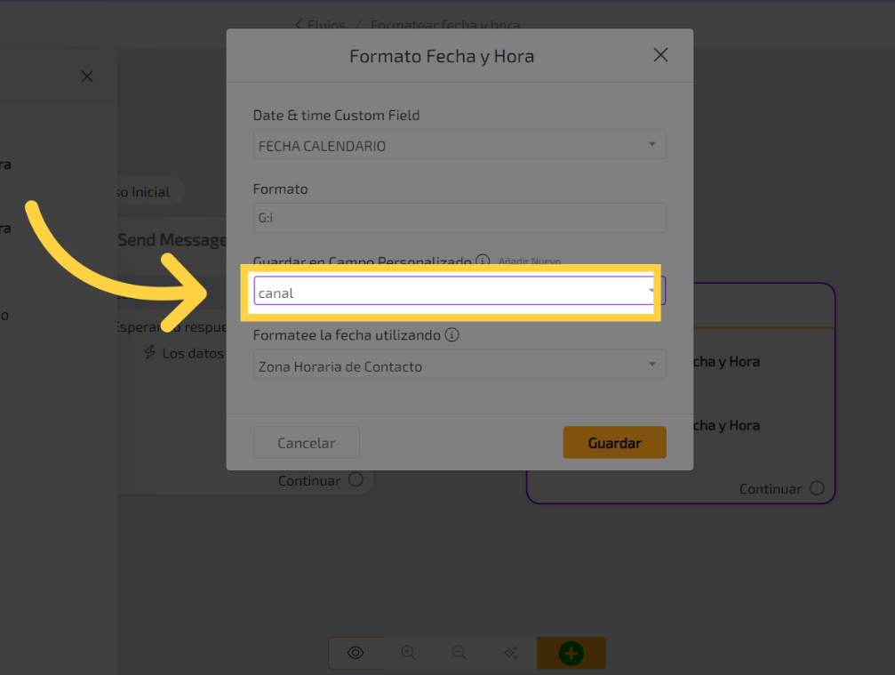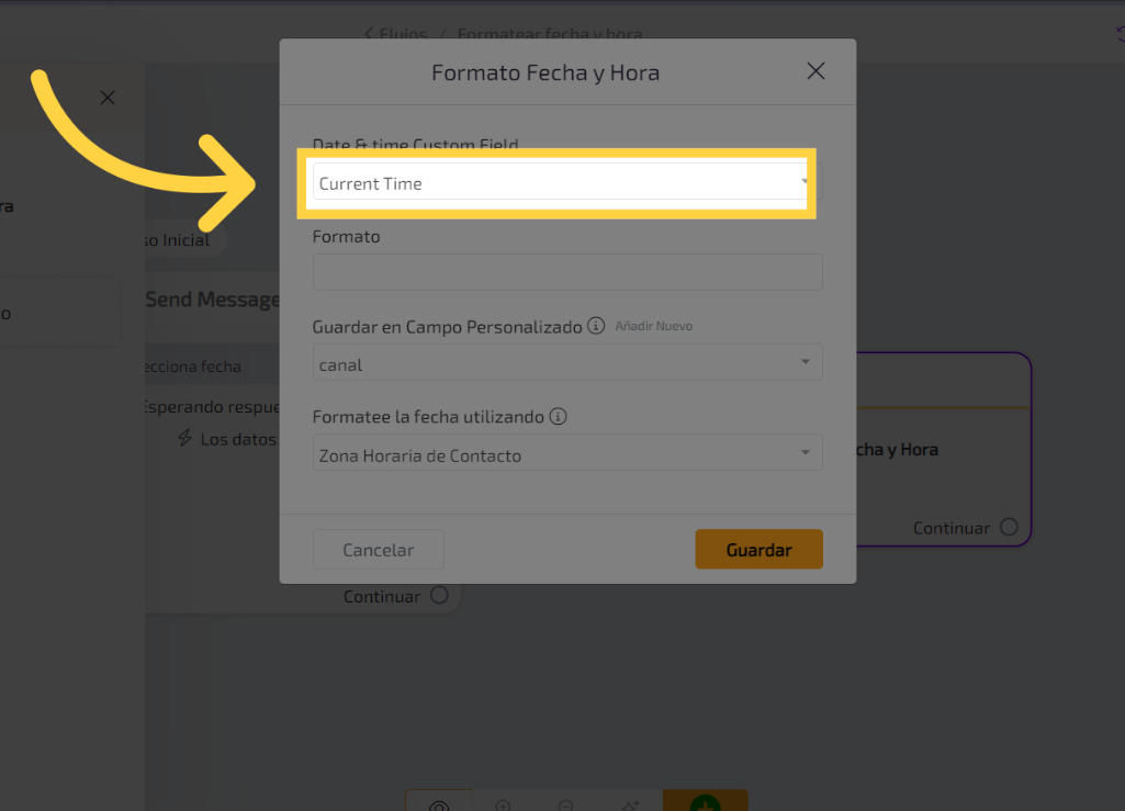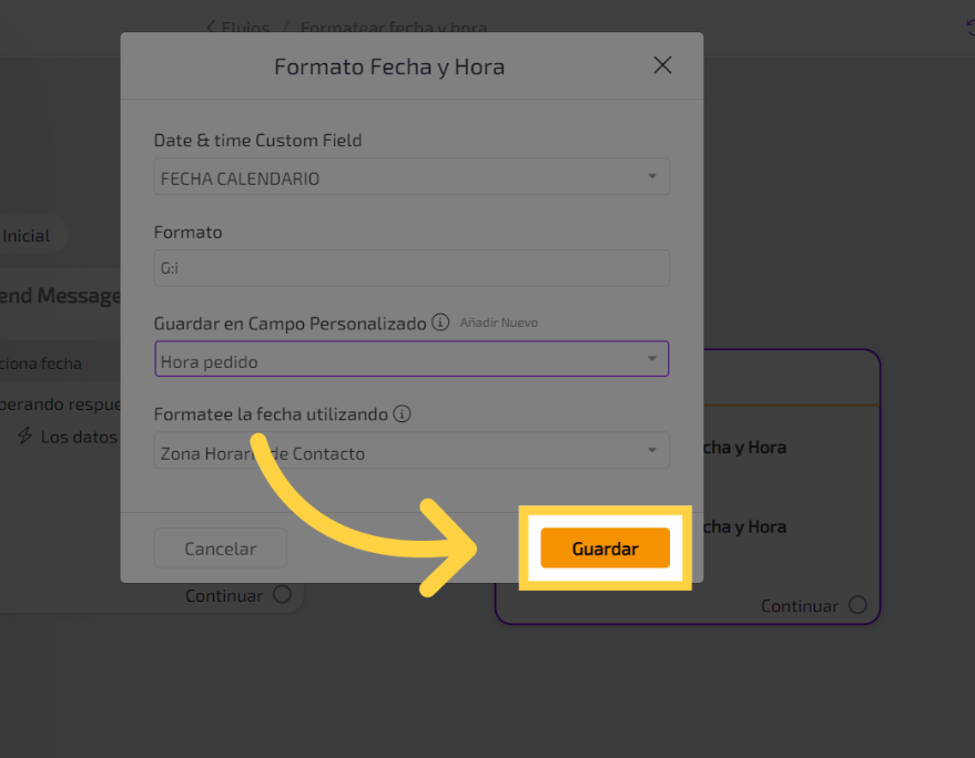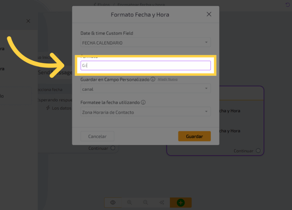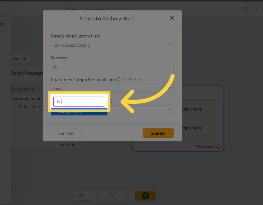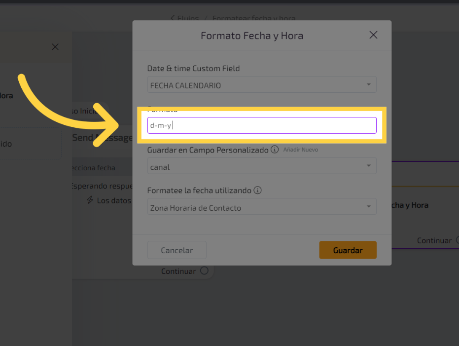 En el siguiente campo, ingresa el formato de la fecha y la hora que necesitas. Consulta el centro de ayuda donde podrás encontrar la tabla con la información sobre los parámetros.