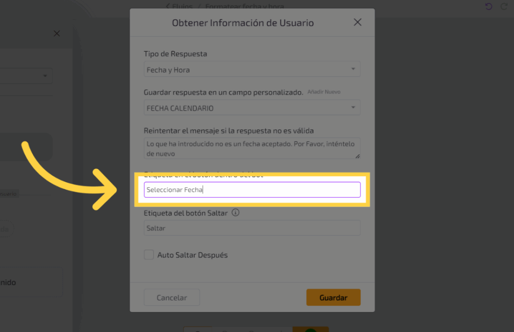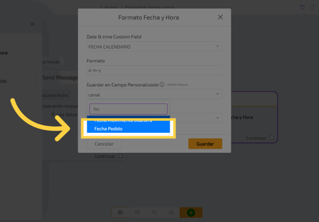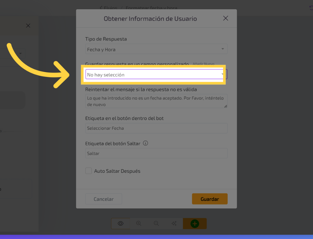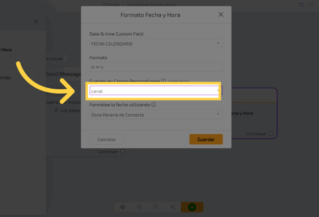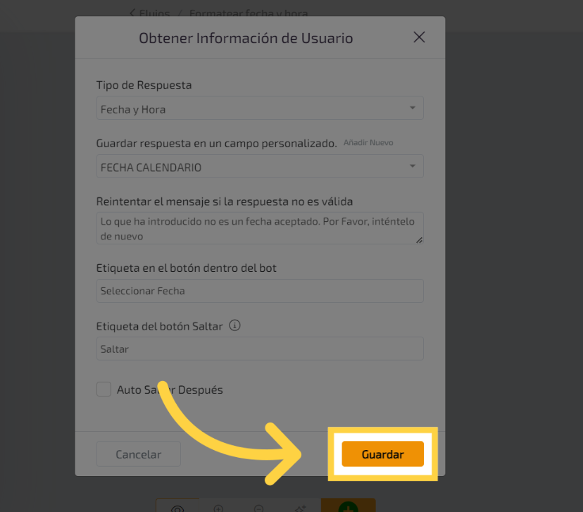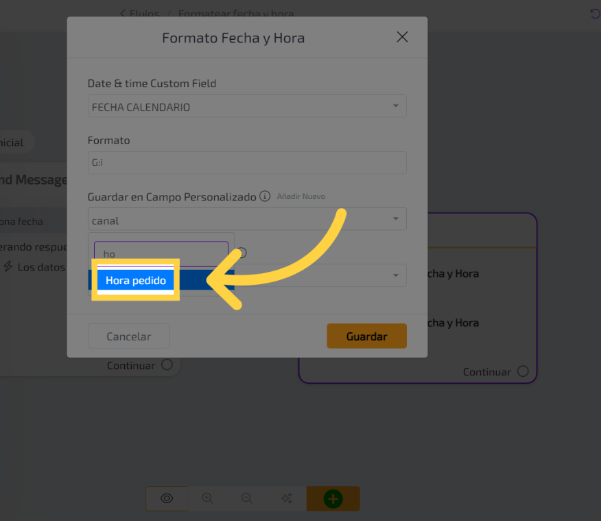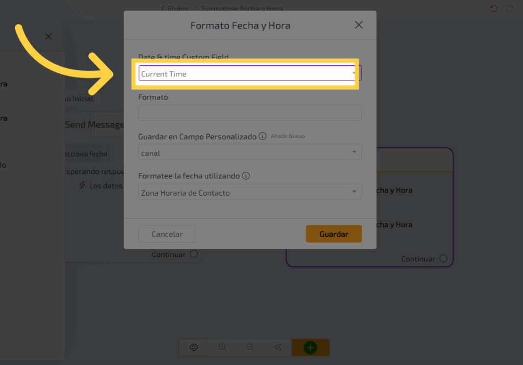 En el siguiente campo, ingresa el formato de la fecha y la hora que necesitas. Consulta el centro de ayuda donde podrás encontrar la tabla con la información sobre los parámetros.