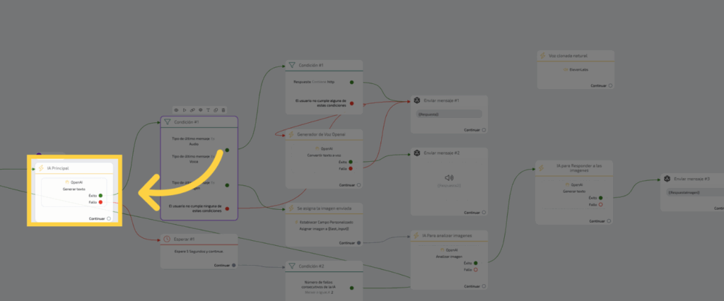 De forma predeterminada, el prompt está configurado como “Describe brevemente qué hay en esta imagen”, pero puedes personalizarlo según tus necesidades específicas. En el siguiente paso, verás cómo el asistente posterior utiliza la información almacenada por esta IA en el campo Respuesta 2 para generar las respuestas correspondientes.