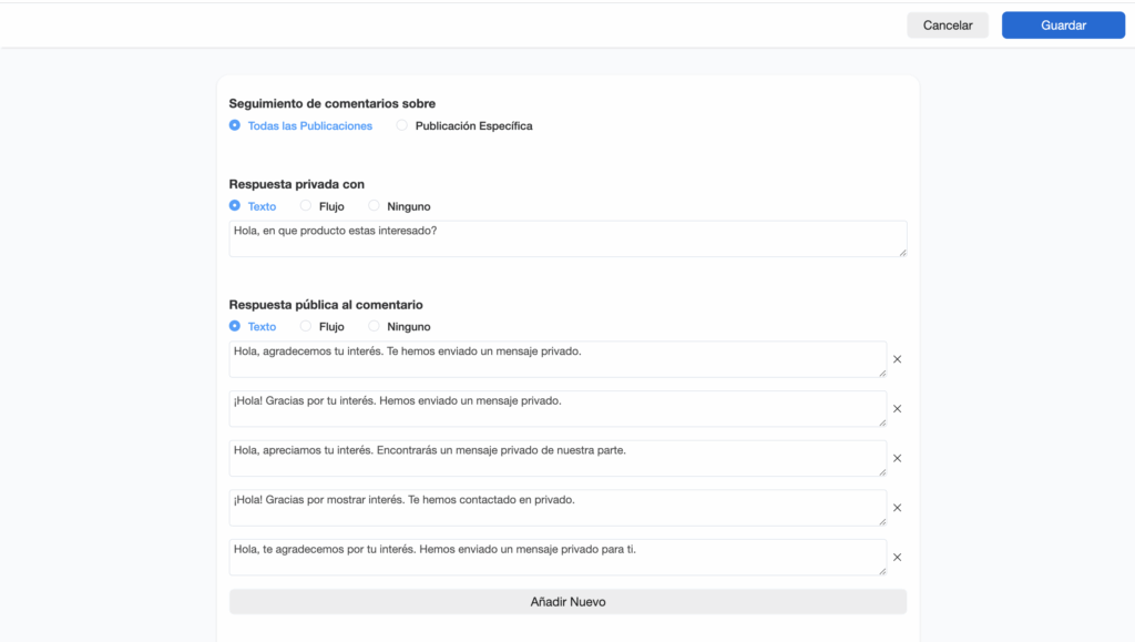 Responder públicamente al comentario: tu bot responderá automáticamente al comentario del usuario con este mensaje. Agrega varias variaciones y tu bot responderá con cualquiera de las variaciones.