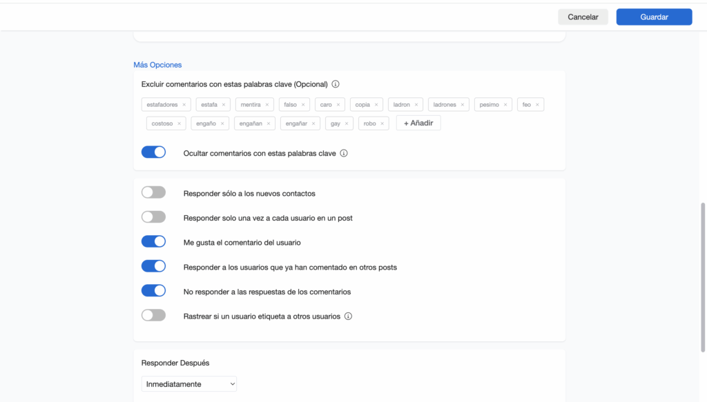 Si no quieres que tu automatización de comentarios de Facebook funcione en comentarios con palabras clave específicas, define las palabras clave y tu automatización de Facebook no funcionará en comentarios que contengan estas palabras clave.