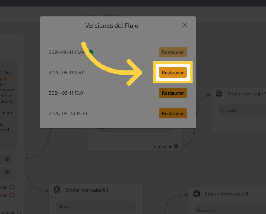Ahora se desplegará todas las fechas y hora en la que el flujo ha sido modificado, elige la opción de “Restaurar” del que desees.