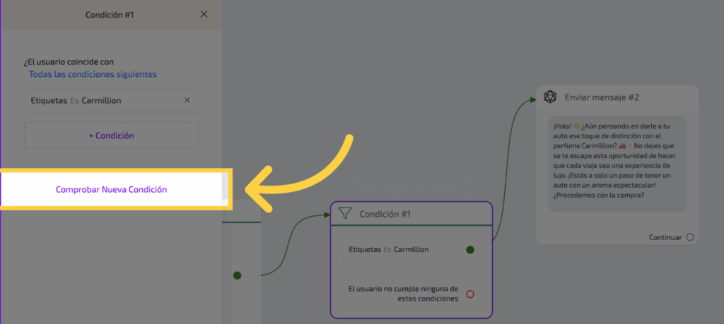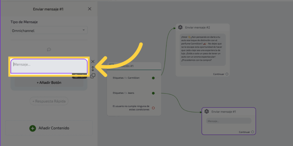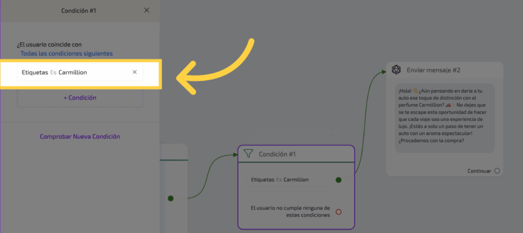 Aquí tenemos que, si la etiqueta es “Carmillion”, se envía el mensaje correspondiente a ese producto. Puedes cambiar la etiqueta haciendo clic en donde dice “etiqueta es”, eliminar la de “Carmillion” y agregar la de tu producto.