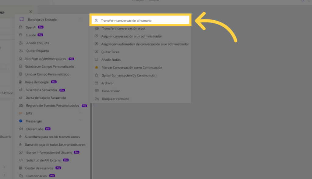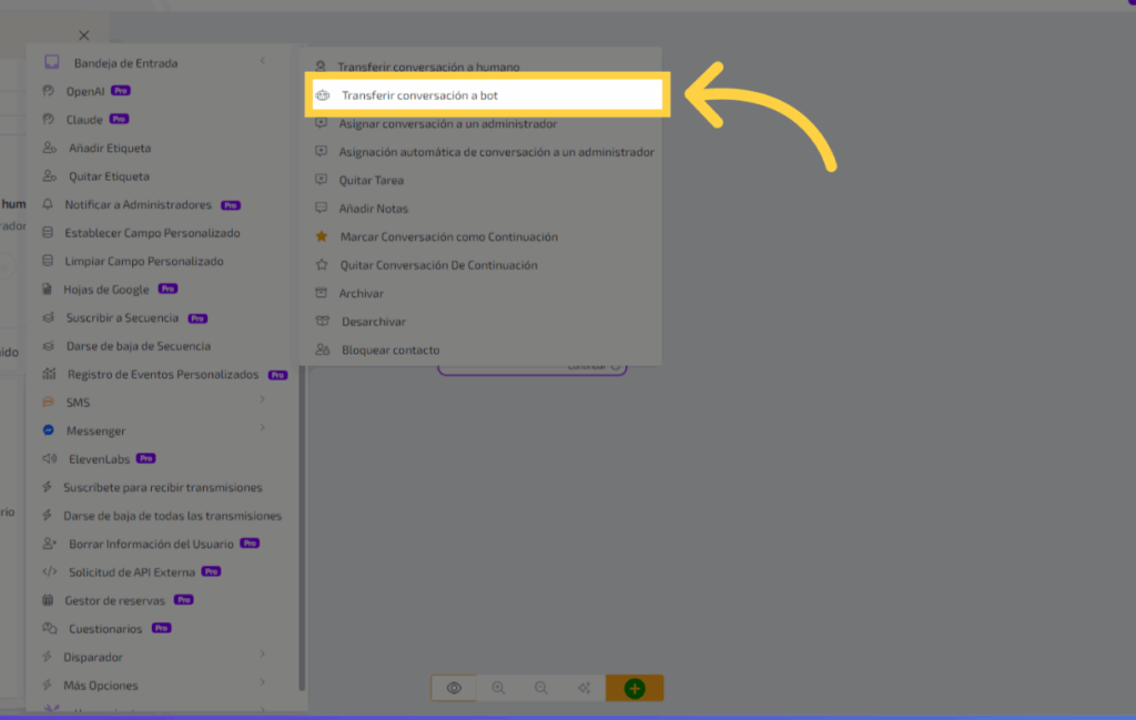 Si quieres transferir al Bot se debe repetir el mismo proceso y selecciona la opción transferir a conversación a Bot
