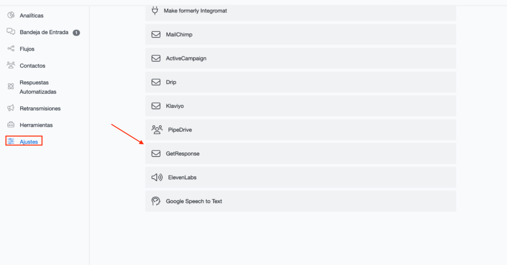 Paso 2: Ve a Configuración y selecciona Integraciones y selecciona Getresponse en el menú superior.