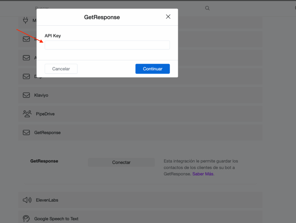 Paso 3: Busca la Integración de GetResponse e ingresa la clave API para continuar.