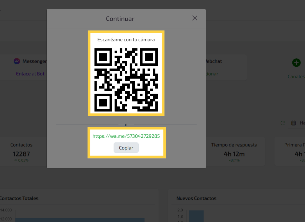 Aquí puedes escanear o “copiar” el enlace para probar o interactuar con tus usuarios dentro de WhatsApp.
